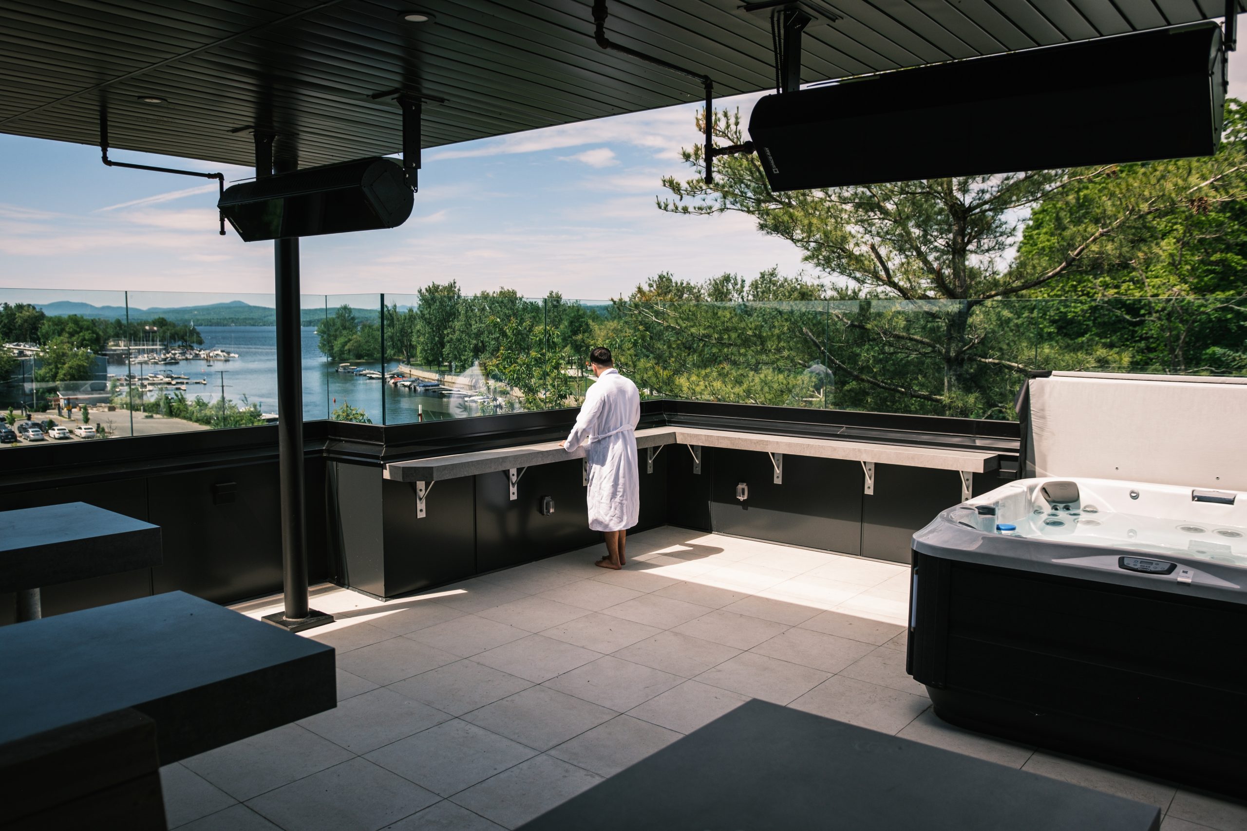 Saunas, spa et douche froide vous attendent sur la terrasse de notre hôtel, avec vue panoramique sur le lac Memphrémagog. Notre terrasse est chauffée, accessible 4 saisons et dispose de tables avec foyer intégré.