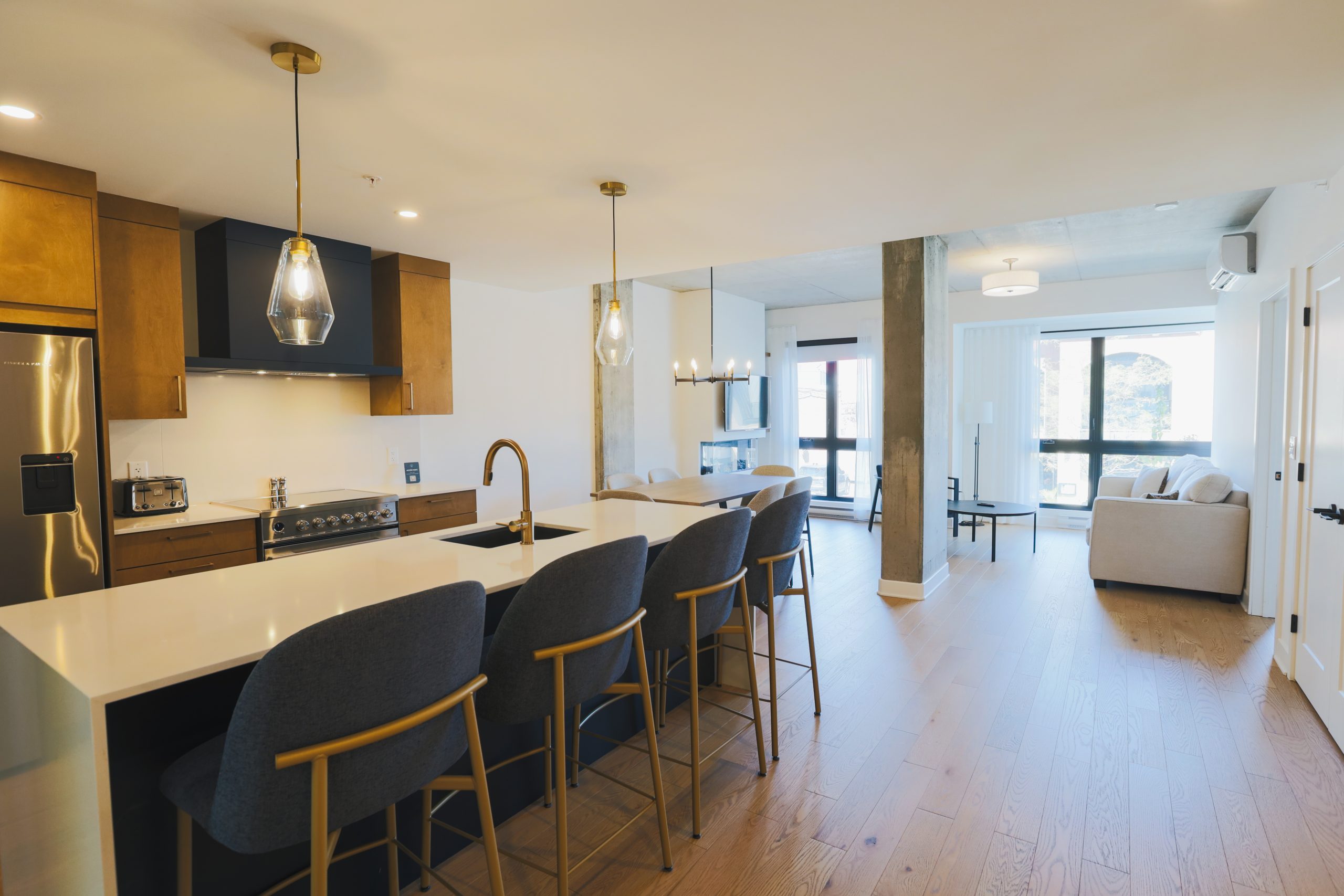 A two-bedroom suite offering a fully equipped kitchen, washer and dryer, a bathtub and queen beds.