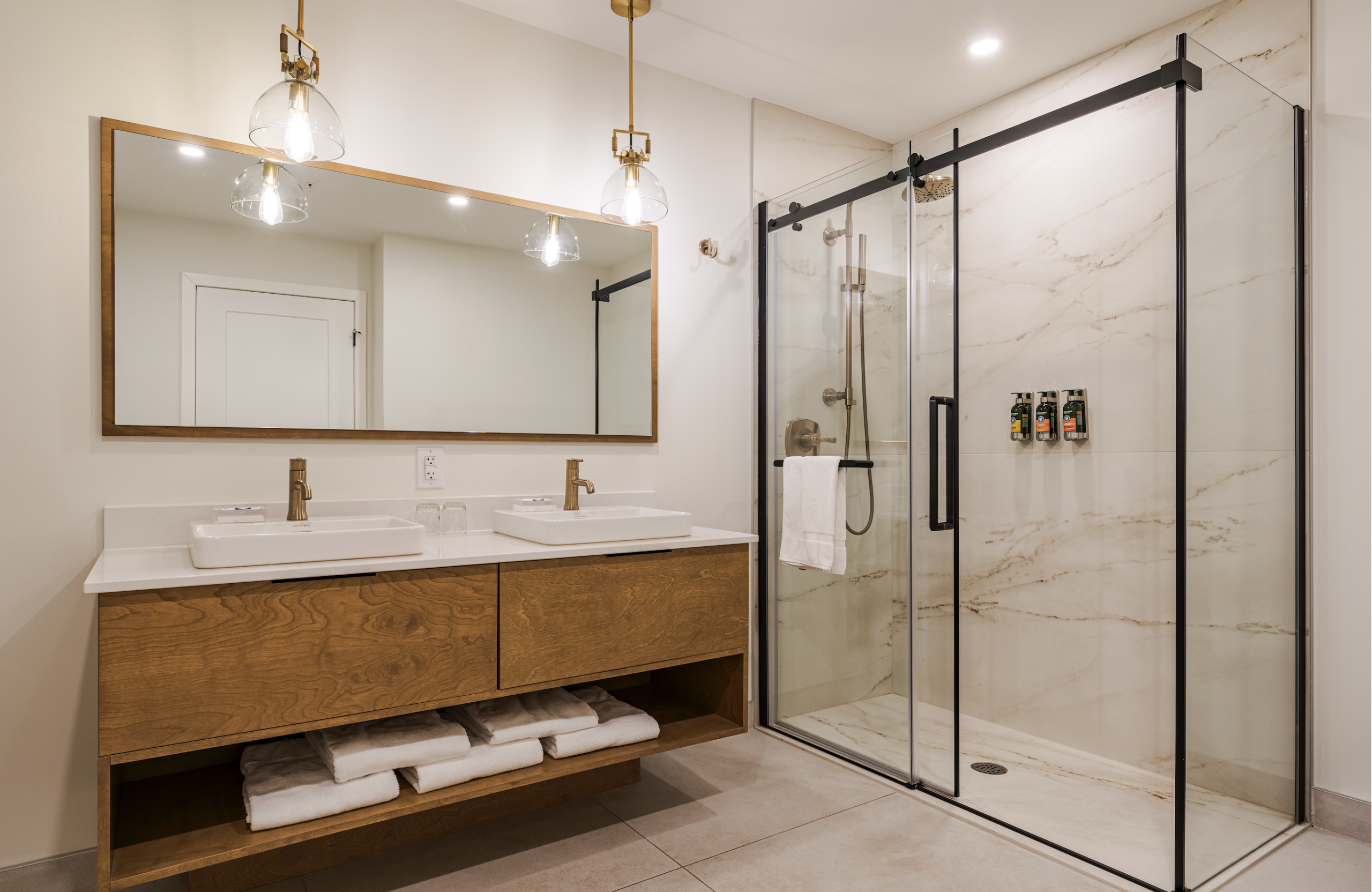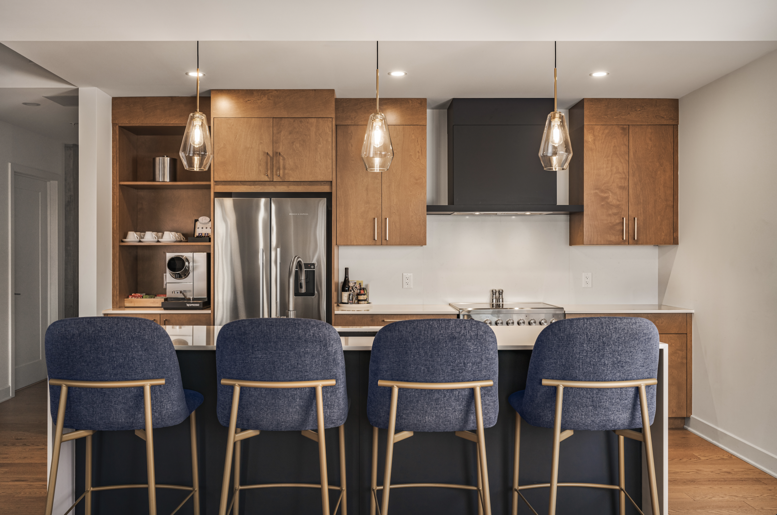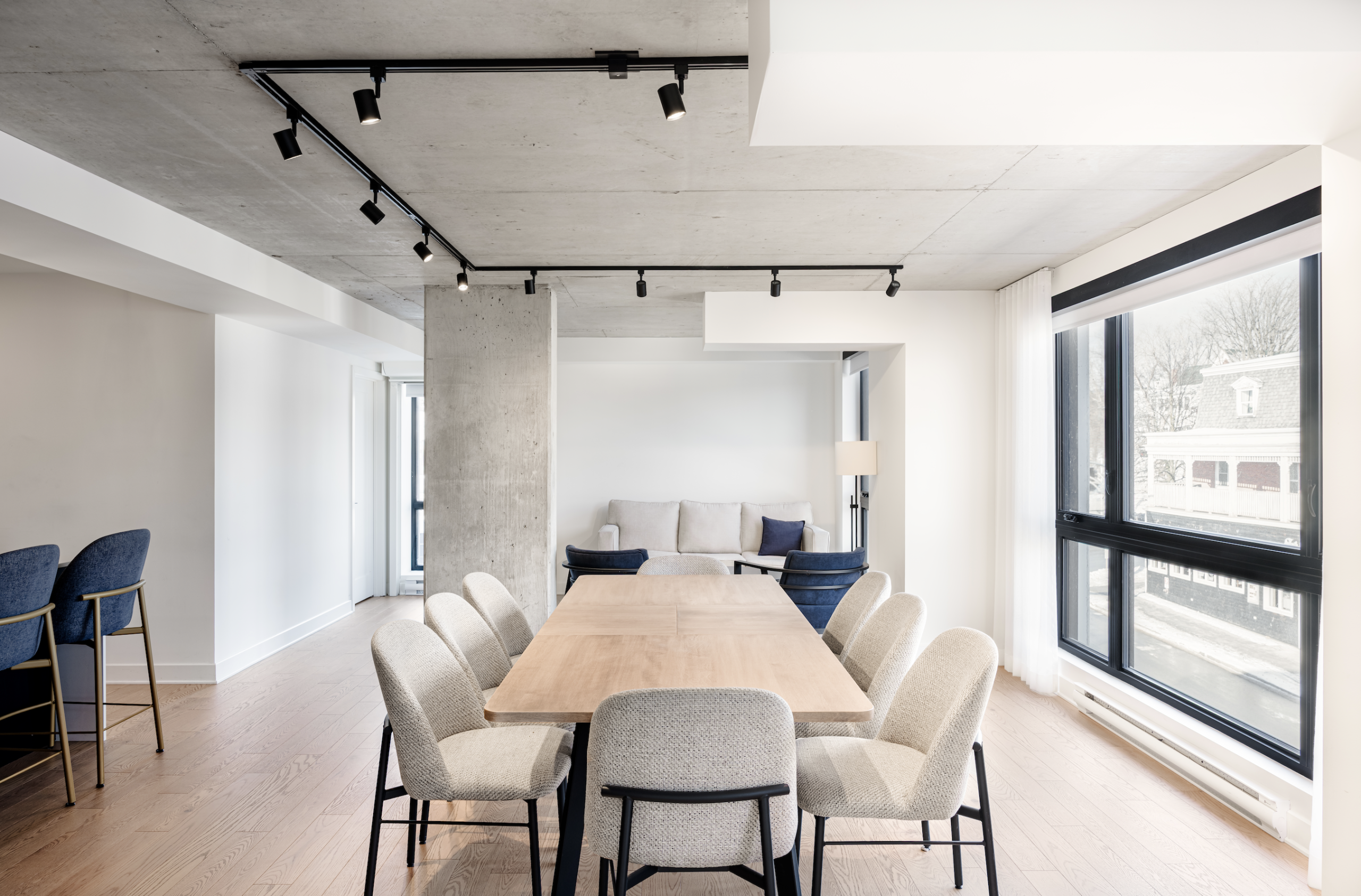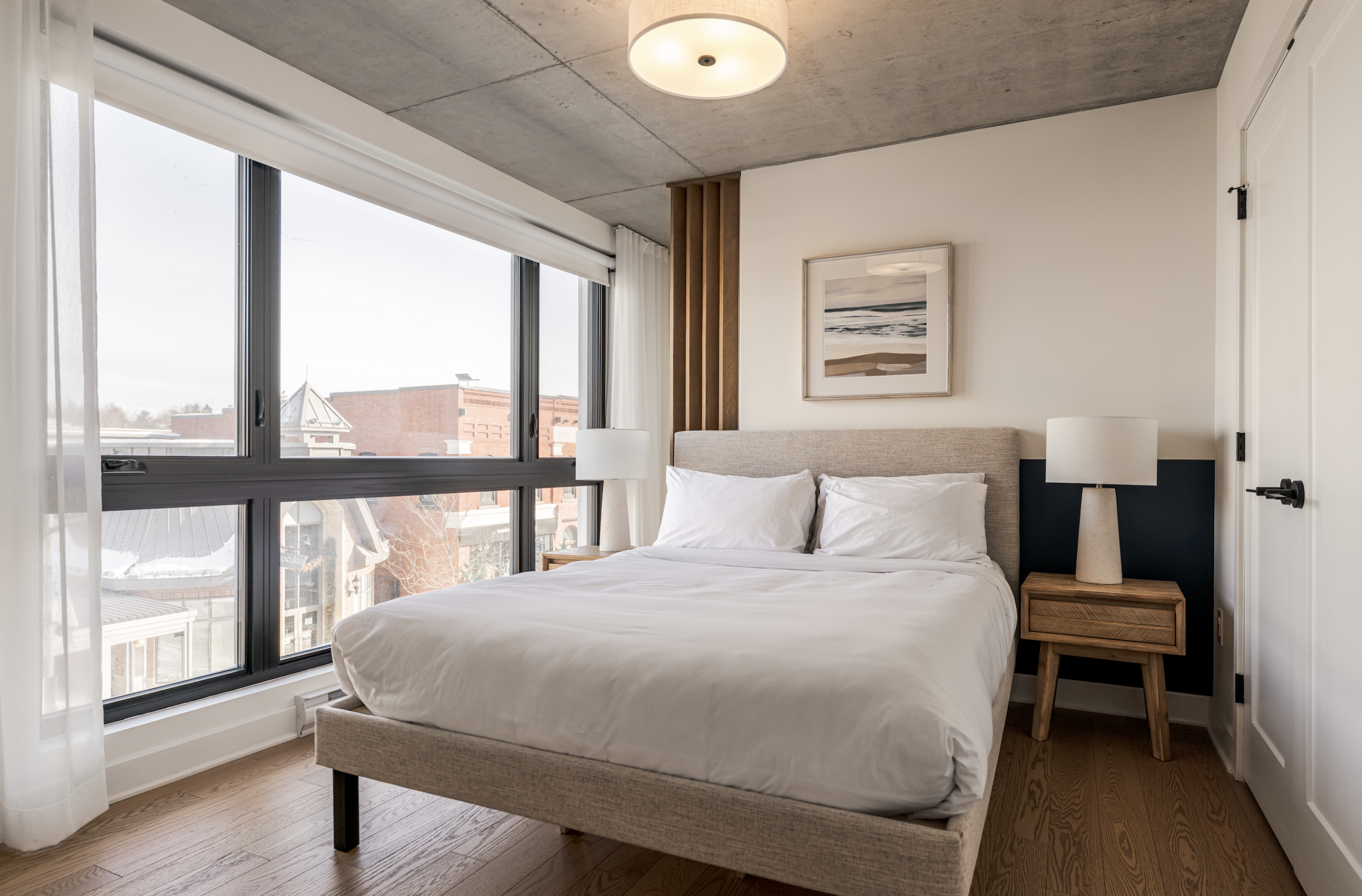 Its heated balcony reveals a panoramic view of Main Street, blending elegance with vibrant city life.