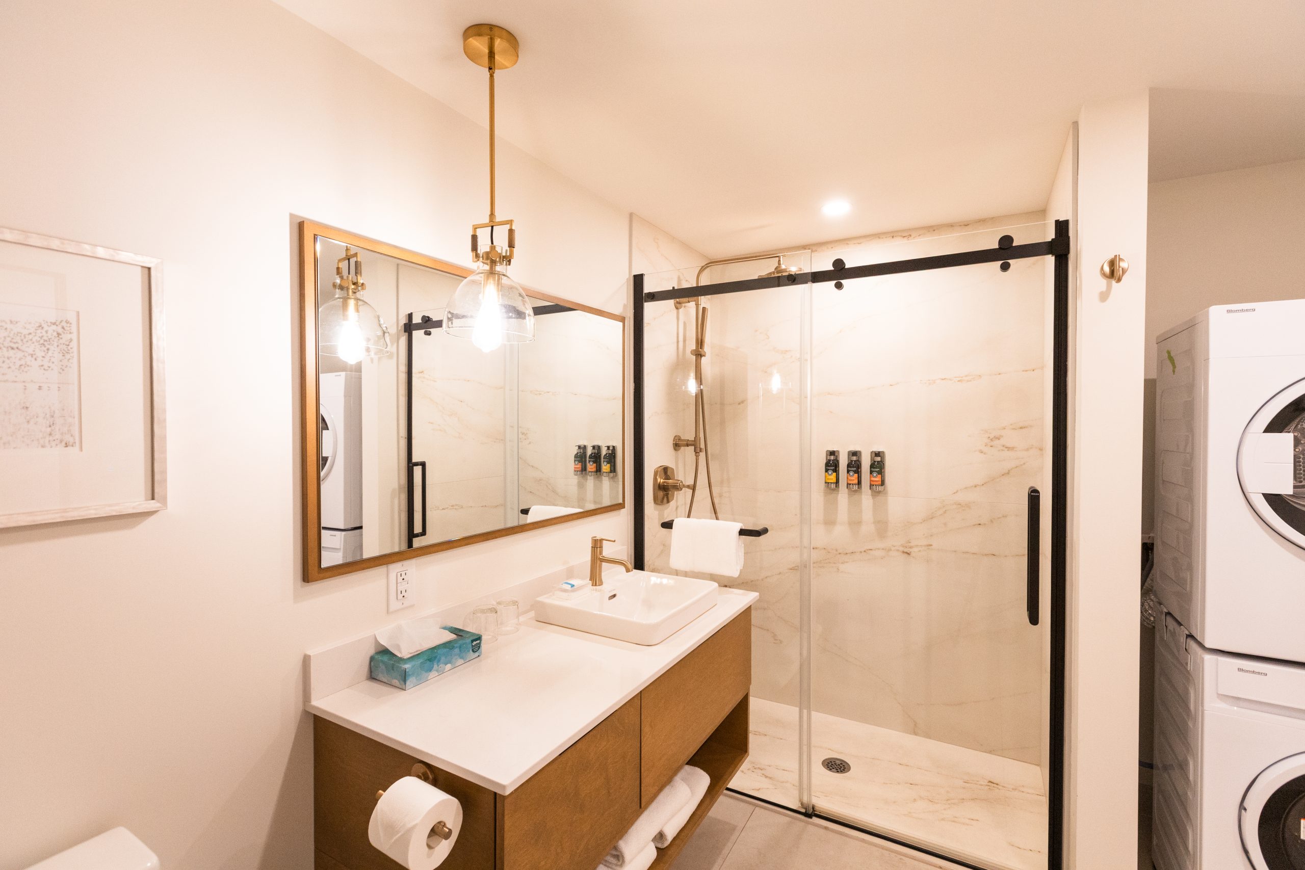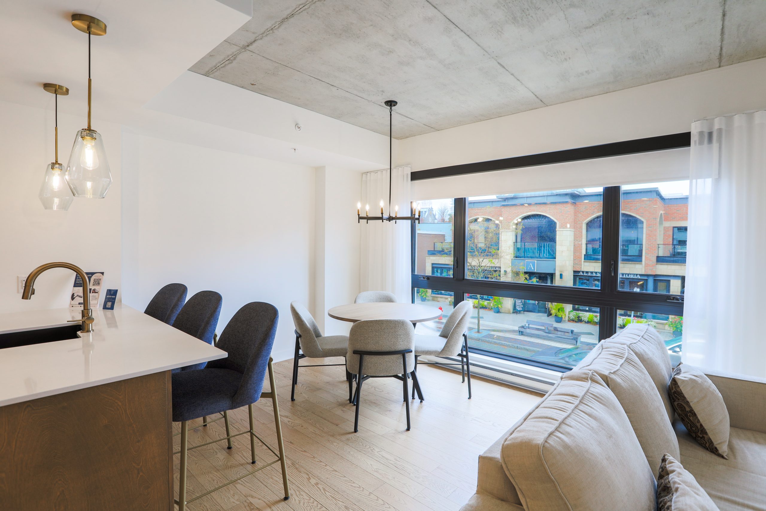 Un studio de luxe au design moderne offrant un espace de vie lumineux, une cuisine entièrement équipée, un grand lit et une vue élégante sur la ville.