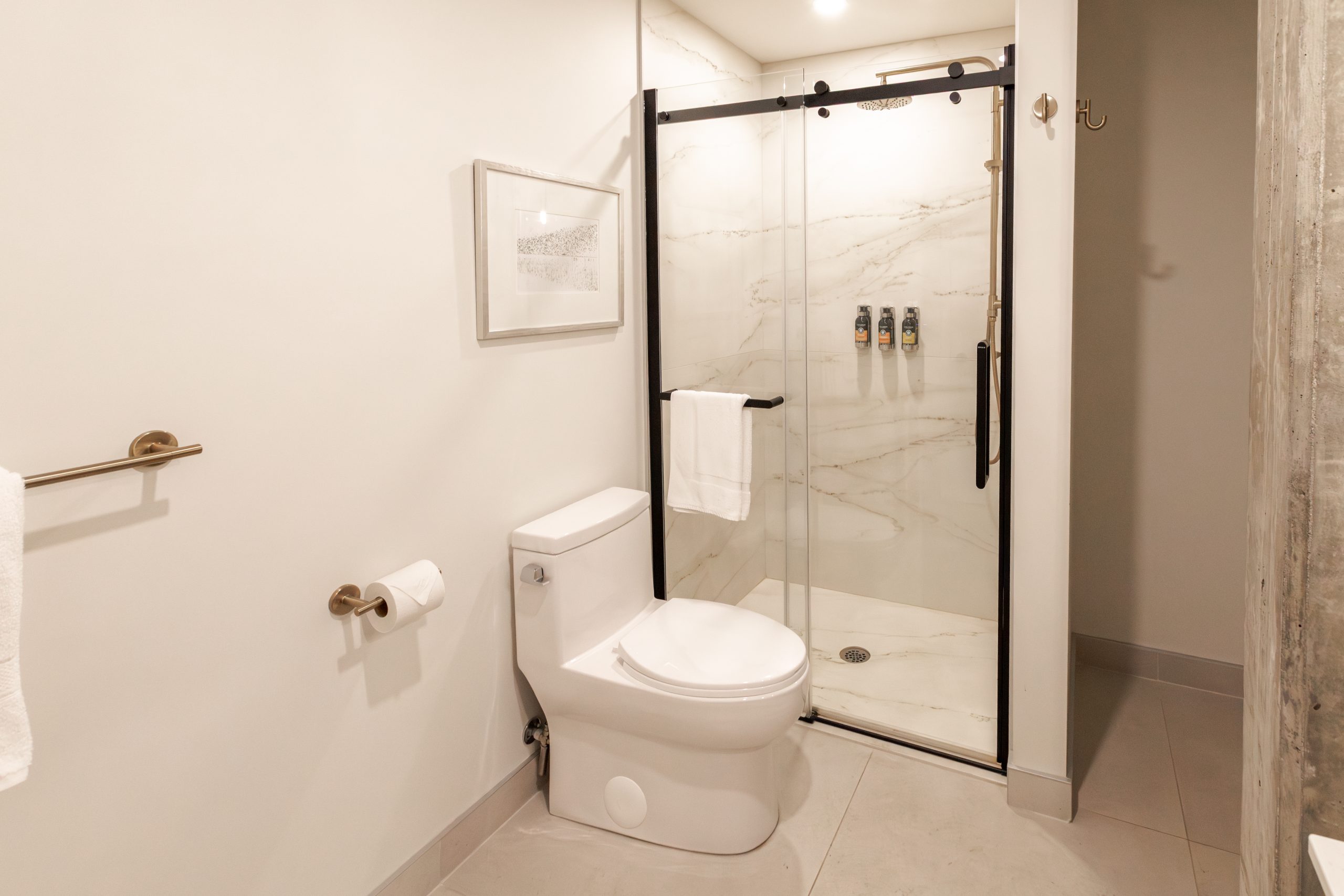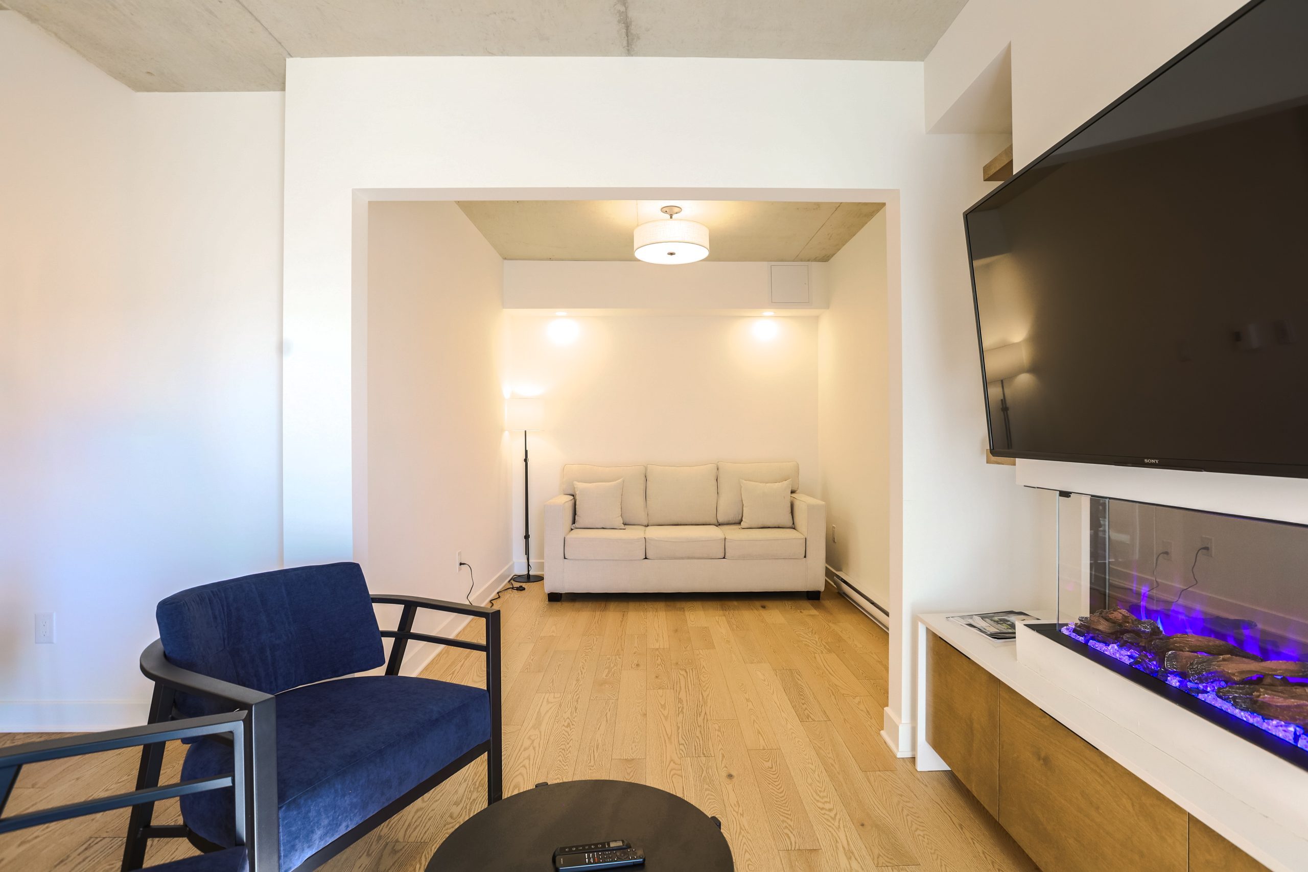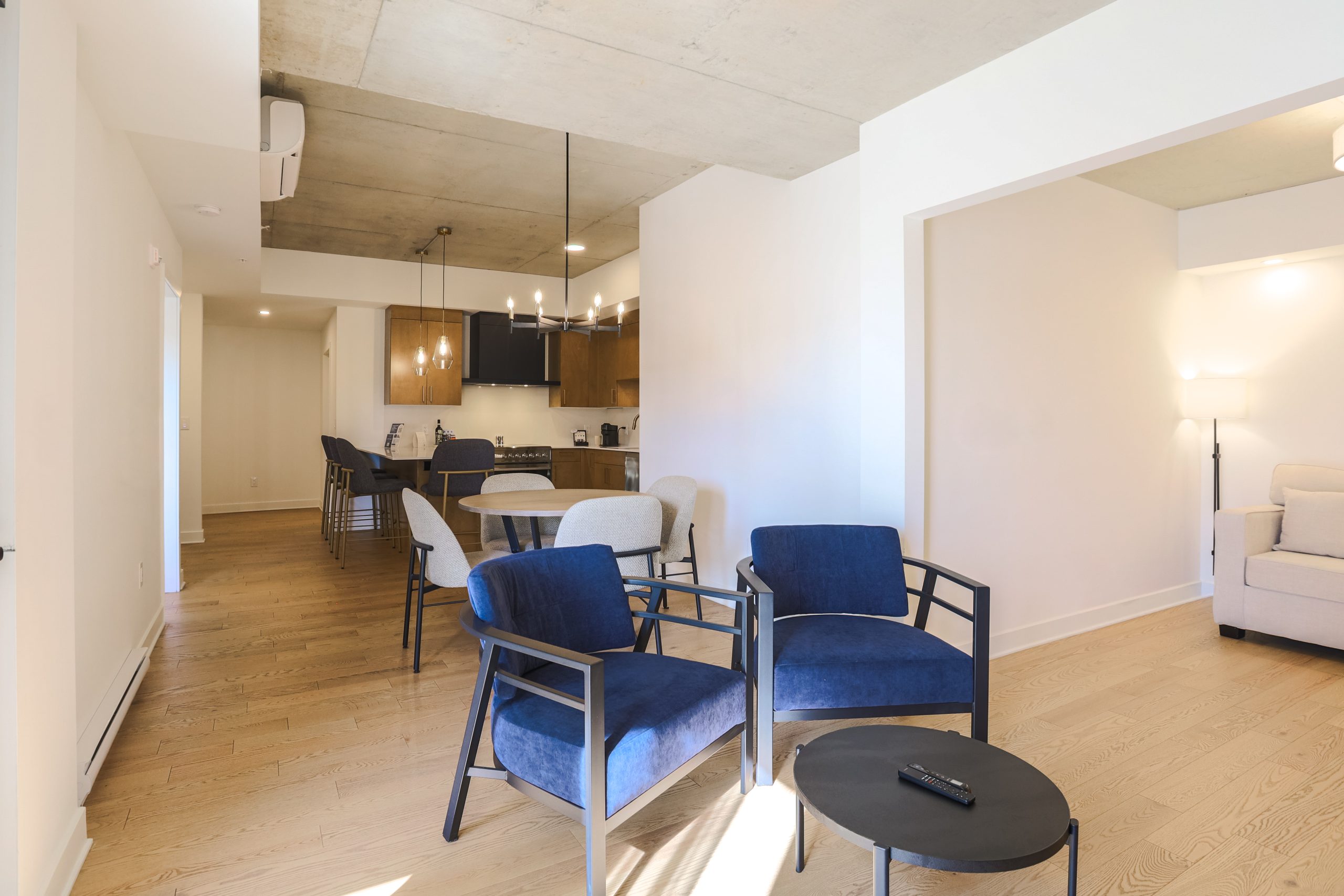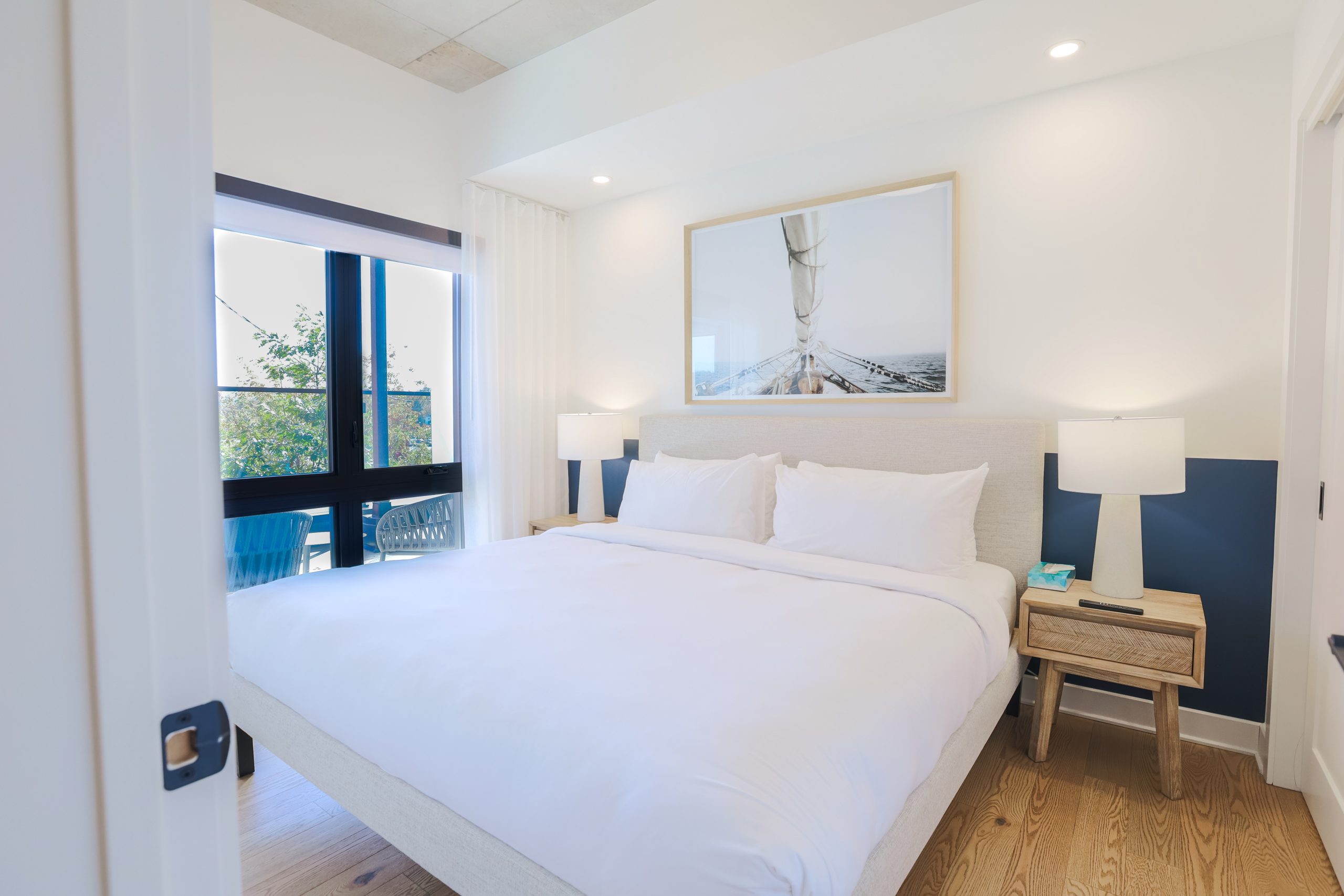 Une suite élégante offrant une chambre fermée, une cuisine complète, une laveuse et sécheuse, un très grand lit et un balcon privé.