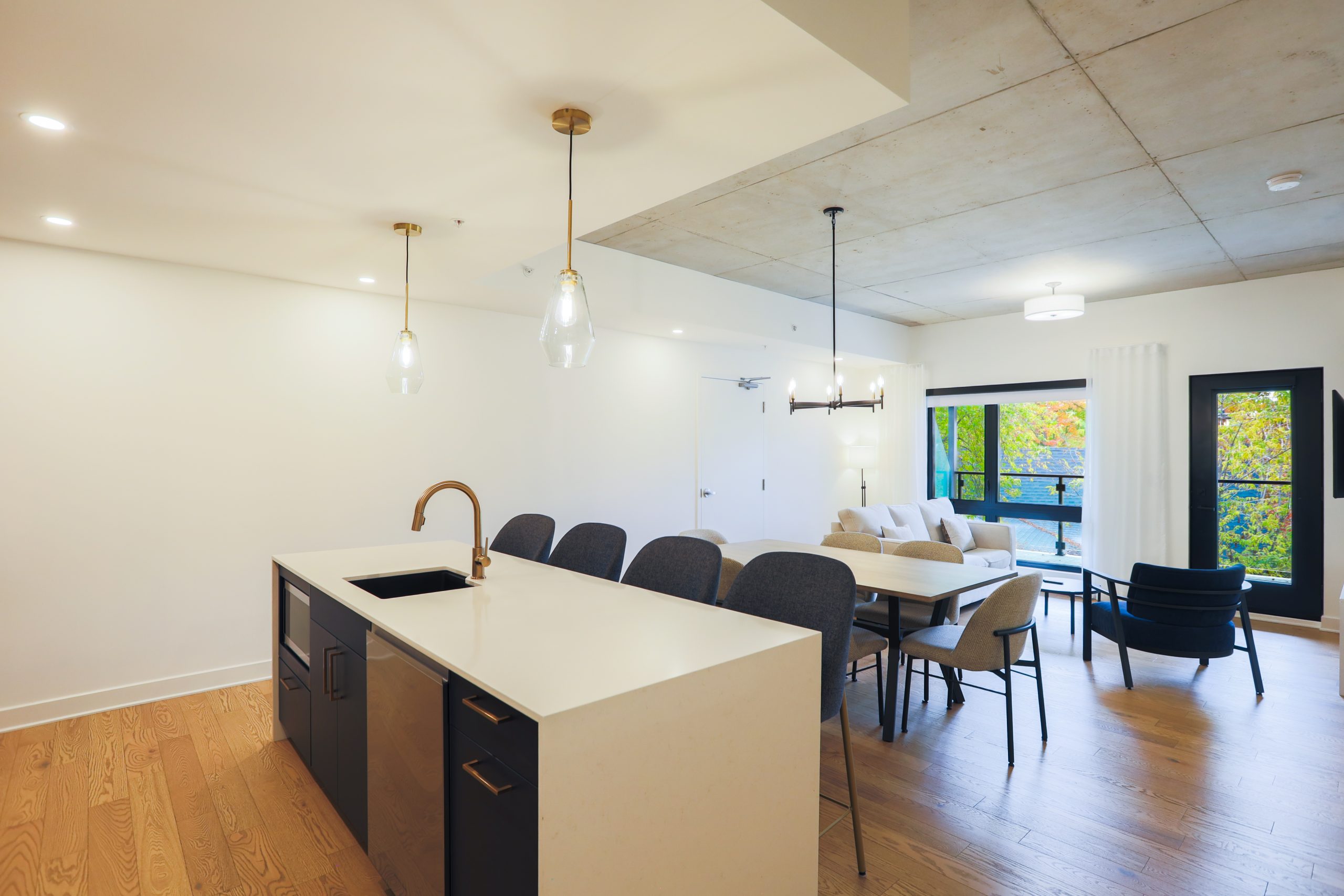 Une Suite élégante offrant une chambre fermée, une cuisine complète, une laveuse et sécheuse, un grand lit et un balcon privé.