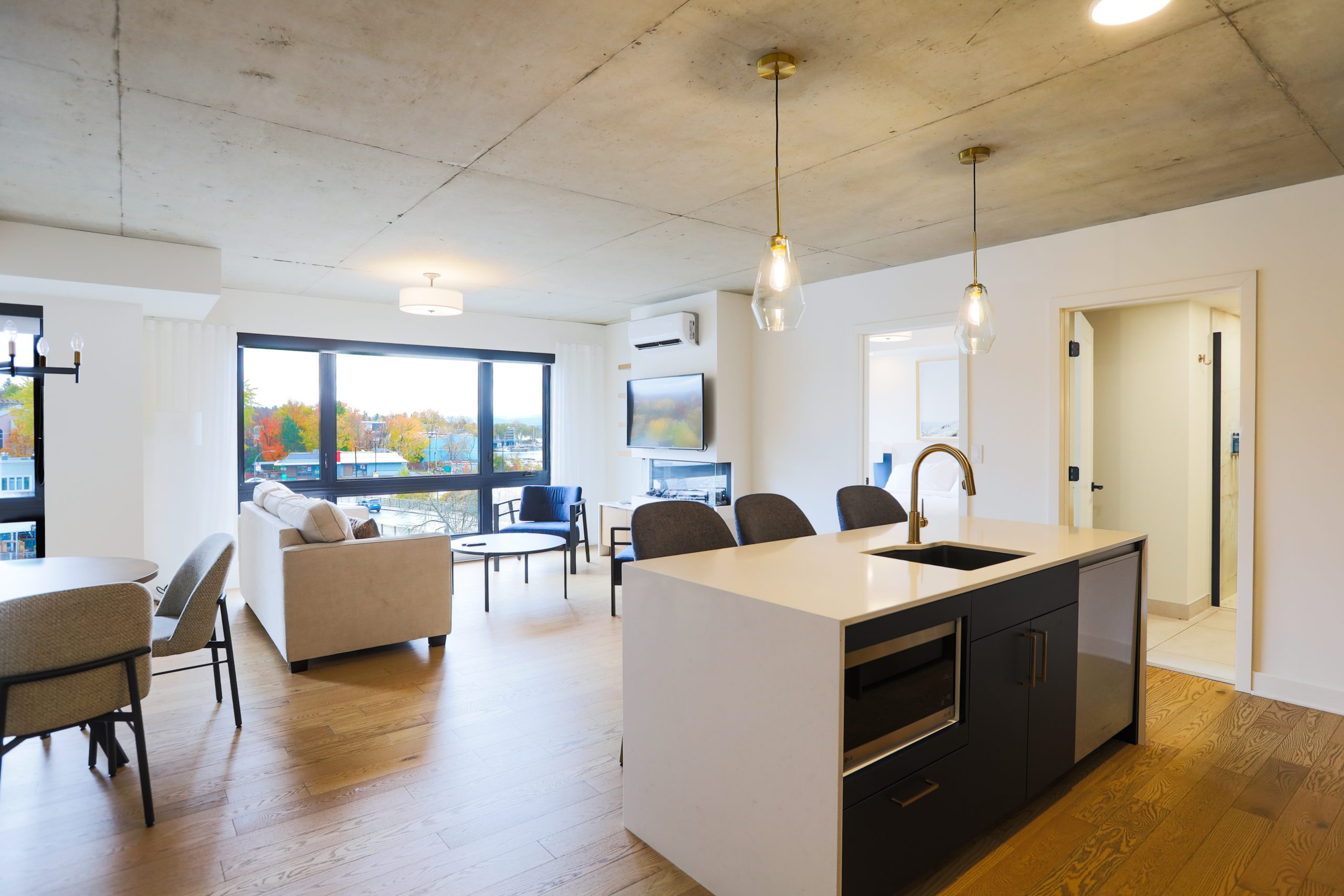 Une Suite d’une chambre offrant une cuisine complète, une salle de bain avec baignoire, une laveuse et sécheuse, ainsi qu’un très grand lit.